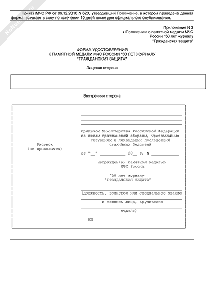 Форма удостоверения к памятной медали МЧС России «50 лет журналу «Гражданская защита» (рекомендуемый образец заполнения)