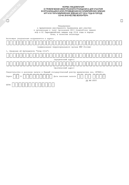Форма уведомления о привлечении иностранного гражданина для участия в организации и (или) проведении XXII Олимпийских зимних игр и XI Паралимпийских зимних игр 2014 года в городе Сочи, в качестве волонтера