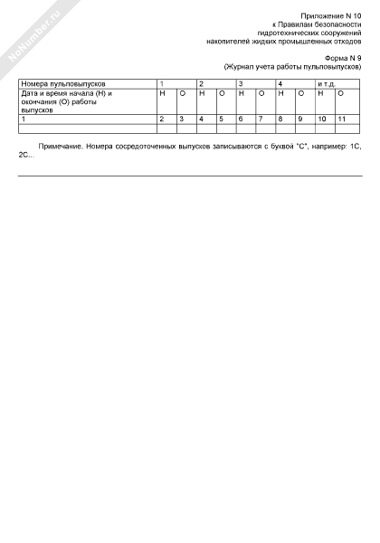Форма журнала наблюдений учета работы пульповыпусков (форма № 9)
