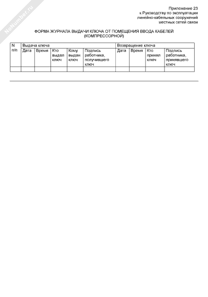 Форма журнала выдачи ключа от помещения ввода кабелей (компрессорной)