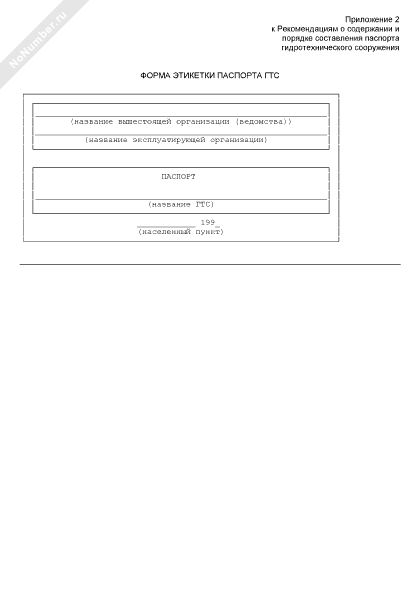 Форма этикетки паспорта гидротехнического сооружения