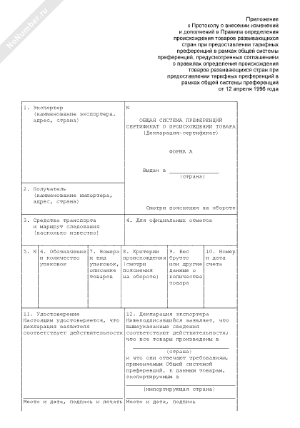 Бланк декларации-сертификата о происхождении товара (форма № A)