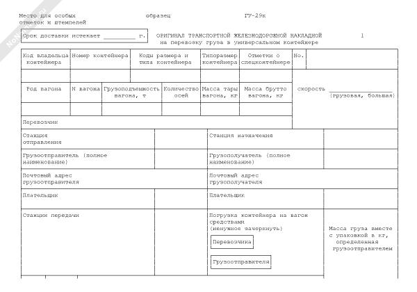 Оригинал транспортной железнодорожной накладной на перевозку груза в универсальном контейнере. Форма № ГУ-29к (рекомендуемый образец заполнения)