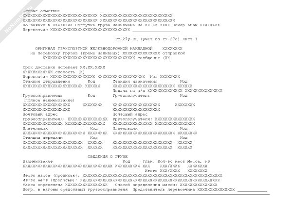 Оригинал транспортной железнодорожной накладной на перевозку грузов (кроме наливных). Форма № ГУ-27у-ВЦ (учет по ГУ-27е) (лист 1)