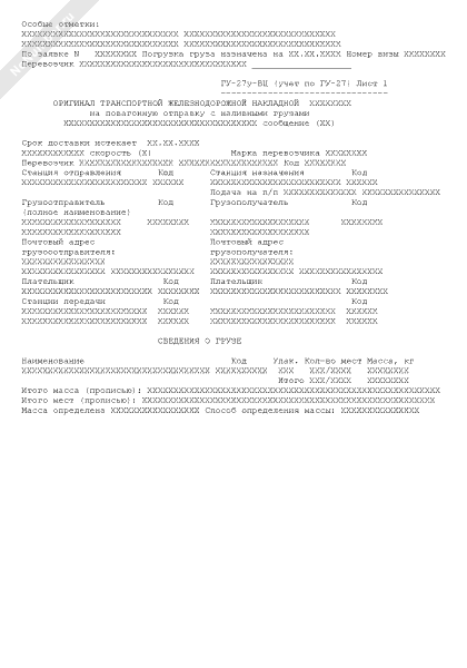Оригинал транспортной железнодорожной накладной на повагонную отправку с наливными грузами. Форма № ГУ-27у-ВЦ (учет по ГУ-27) (лист 1)