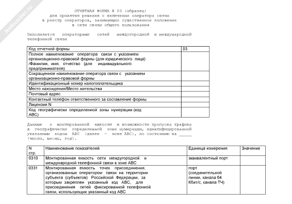Отчетная форма для принятия решения о включении оператора связи в реестр операторов, занимающих существенное положение в сети связи общего пользования. Форма № 03 (рекомендуемый образец заполнения)
