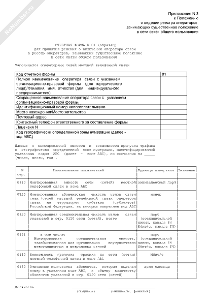 Отчетная форма для принятия решения о включении оператора связи в реестр операторов, занимающих существенное положение в сети связи общего пользования. Форма № 01 (рекомендуемый образец заполнения)