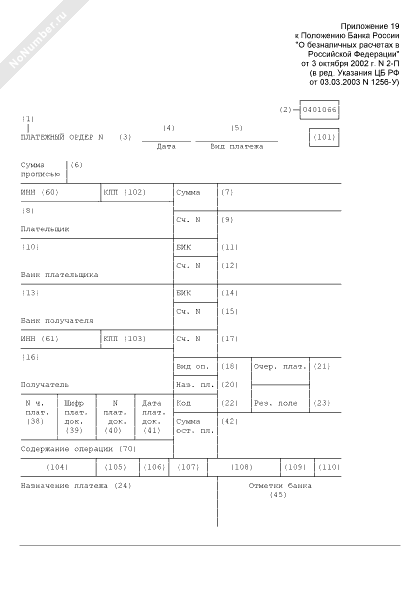 Поля, отведенные для проставления значений реквизитов в бланке платежного ордера. Форма № 0401066 (рекомендуемый образец заполнения)