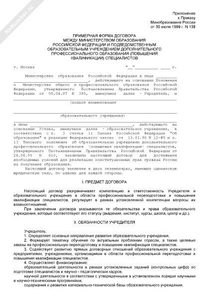 Примерная форма договора между Министерством образования Российской Федерации и подведомственным образовательным учреждением дополнительного профессионального образования (повышения квалификации) специалистов