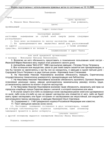 Примерная форма завещания