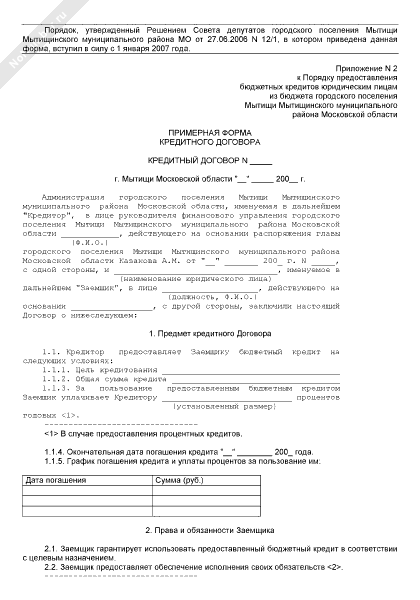 Примерная форма кредитного договора для предоставления бюджетного кредита юридическому лицу городского поселения Мытищи Мытищинского муниципального района Московской области (рекомендуемый образец заполнения)