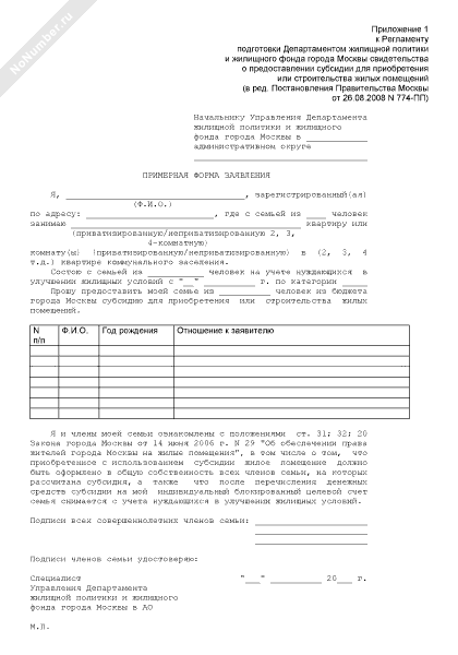 Примерная форма заявления очередников на получение из бюджета города Москвы субсидии для приобретения или строительства жилых помещений (рекомендуемый образец заполнения)