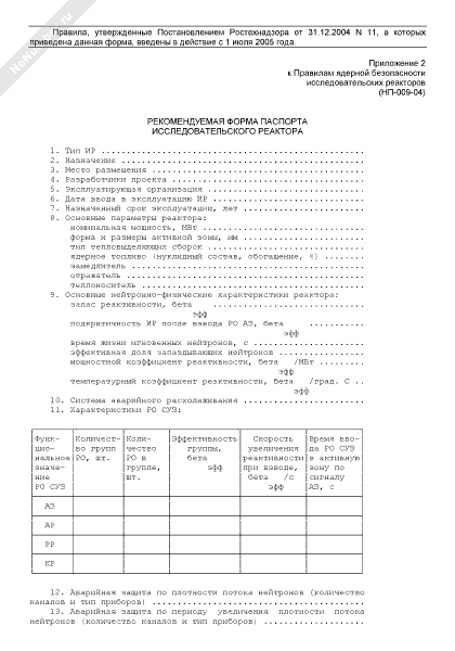 Рекомендуемая форма паспорта исследовательского реактора
