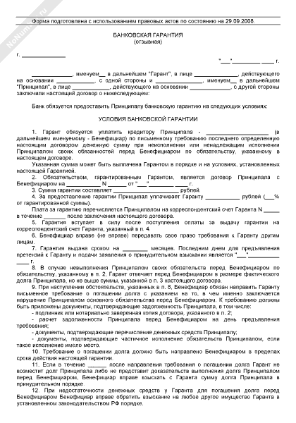 Гарантия в обеспечение наличных платежей (форма № 1)