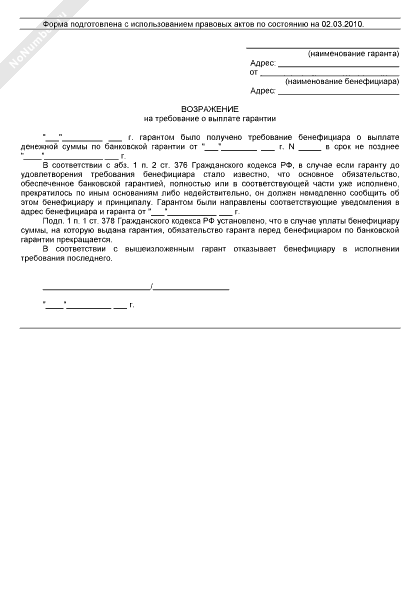 Возражение гаранта на требование бенефициара о выплате гарантии в связи с ее прекращением по причине, что сумма, на которую была выдана банковская гарантия, бенефициару уже уплачена (рекомендуемый образец заполнения)