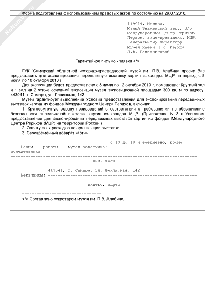- 14Гарантийное письмо — заявка о предоставлении музею для экспонирования передвижную выставку картин