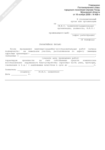 - 10Гарантийное письмо на восстановление нарушенного благоустройства после производства земляных работ на территории городского поселения Сергиев Посад Московской области