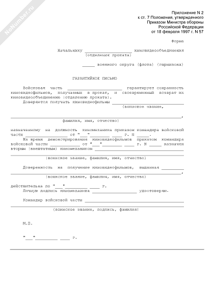 - 2Гарантийное письмо о сохранности киновидеофильмов, получаемых в прокат войсковой частью, и своевременный возврат их киновидеообъединению (отделению проката)