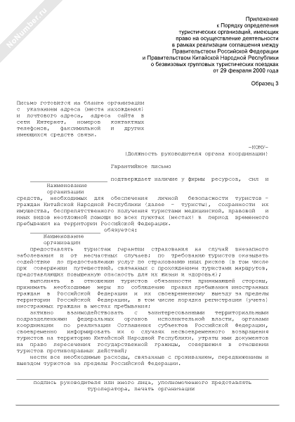 - 8Гарантийное письмо туристической организации о наличии ресурсов, сил и средств, необходимых для обеспечения личной безопасности туристов — граждан Китайской Народной Республики, сохранности их имущества, беспрепятственного получения туристами медицинской, правовой и иных видов неотложной помощи во всех пунктах (местах) в период временного пребывания на территории Российской Федерации