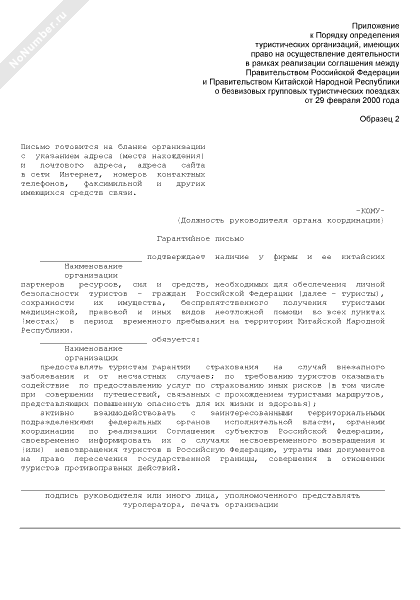 - 7Гарантийное письмо туристической организации о наличии у фирмы и ее китайских партнеров ресурсов, сил и средств, необходимых для обеспечения личной безопасности туристов — граждан Российской Федерации, сохранности их имущества, беспрепятственного получения туристами медицинской, правовой и иных видов неотложной помощи во всех пунктах (местах) в период временного пребывания на территории Китайской Народной республики