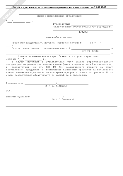 - 13Гарантийное письмо в детское оздоровительное учреждение об оплате путевок (направляется в целях бронирования путевок, оплачиваемых за счет ФСС, до получения положительного ответа на заявку о выделении ассигнований)