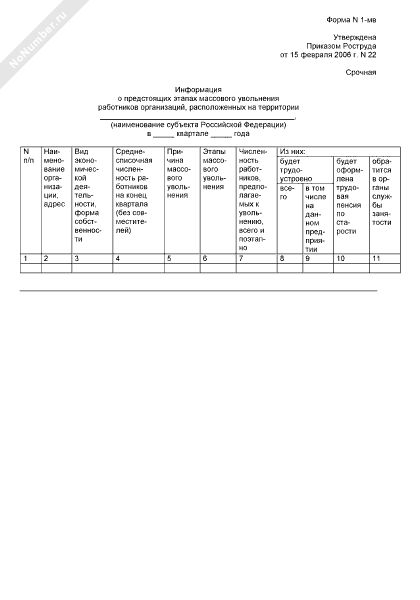 - 259Информация о предстоящих этапах массового увольнения работников организаций, расположенных на территории субъекта Российской Федерации. Форма № 1-МВ