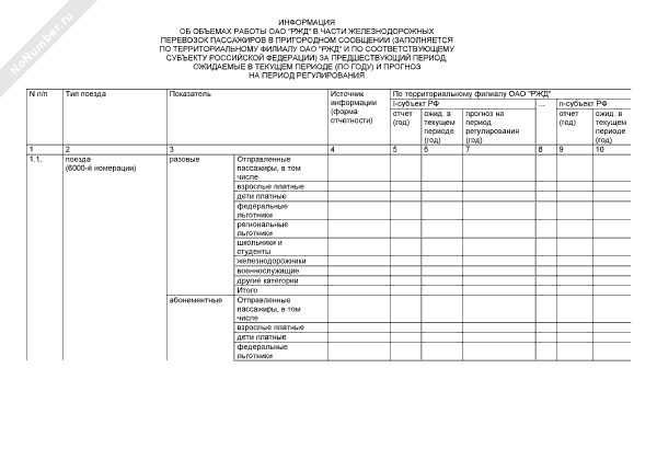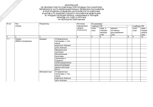 - 520Информация об объемах работы компании пригородных пассажирских перевозок в части железнодорожных перевозок пассажиров в пригородном сообщении (заполняется по компании в целом и по каждому субъекту Российской Федерации) за предшествующий период, ожидаемые в текущем периоде (по году) и прогноз на период регулирования