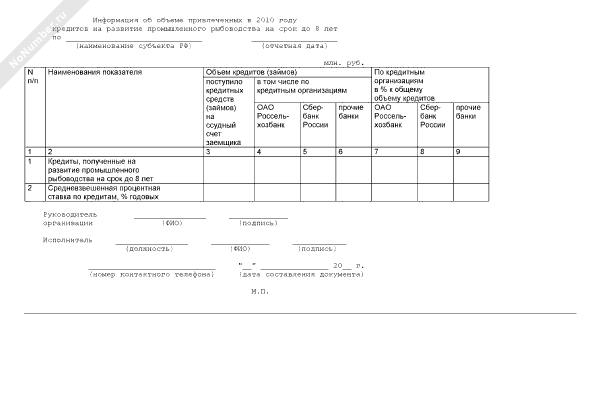 - 515Информация об объеме привлеченных в 2010 году кредитов на развитие промышленного рыбоводства на срок до 8 лет (приложение к отчету о расходах бюджета субъекта РФ (местного бюджета), источником финансового обеспечения которых является субсидия из федерального бюджета)