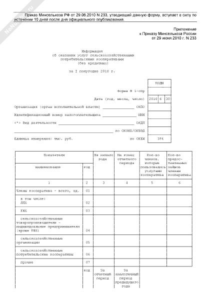 - 516Информация об оказании услуг сельскохозяйственными потребительскими кооперативами (без кредитных). Форма № 1-спр