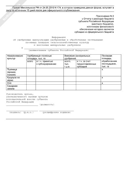 - 530Информация об удобренных минеральными удобрениями и обработанных пестицидами посевных площадях сельскохозяйственных культур и внесенных минеральных удобрениях (приложение к отчету о расходах бюджета субъекта Российской Федерации (местного бюджета), источником финансового обеспечения которого является субсидия из федерального бюджета)
