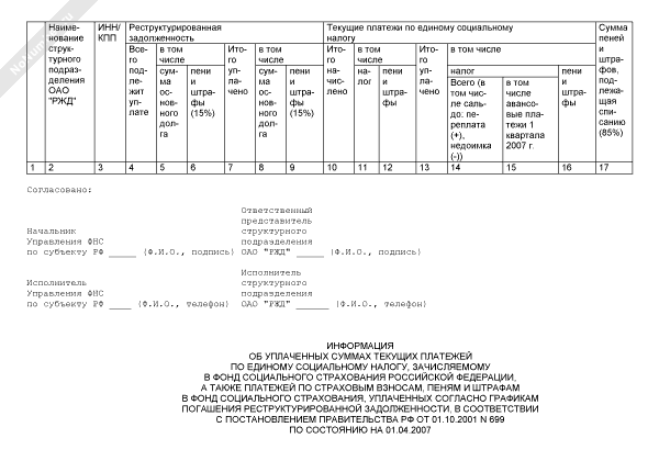 - 522Информация об уплаченных суммах текущих платежей по единому социальному налогу, зачисляемому в федеральный бюджет, а также платежей по страховым взносам, пеням и штрафам в Пенсионный фонд РФ, уплаченных согласно графикам погашения реструктурированной задолженности, в соответствии с Постановлением Правительства РФ от 01.10.2001 № 699