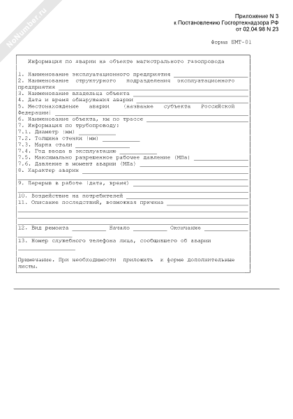 - 535Информация по аварии на объекте магистрального газопровода. Форма № БМТ-01