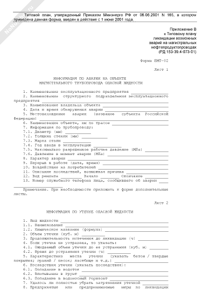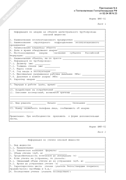 - 536Информация по аварии на объекте магистрального трубопровода опасной жидкости. Форма № БМТ-02