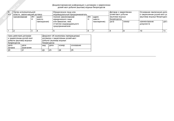 - 671Права на добычу (вылов) водных биоресурсов, отнесенных к объектам рыболовства. Документированная информация о договорах о закреплении долей квот добычи (вылова) водных биоресурсов. Форма № 4.2.1.-грр