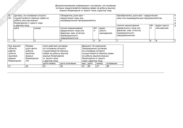 - 672Права на добычу (вылов) водных биоресурсов, отнесенных к объектам рыболовства. Документированная информация о договорах, на основании которых осуществляется переход права на добычу (вылов) водных биоресурсов от одного лица к другому лицу. Форма № 4.2.2.-грр