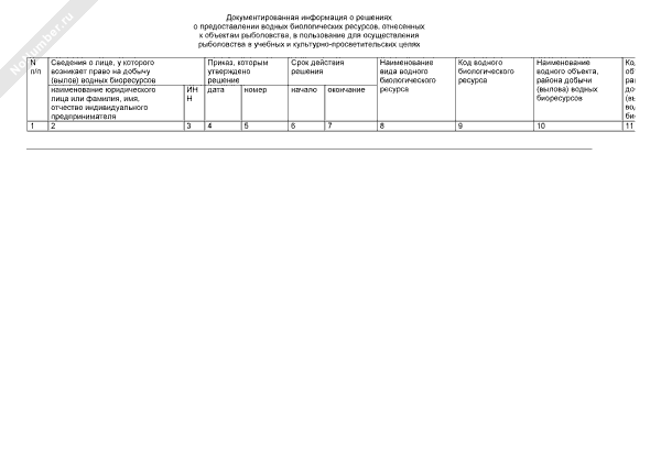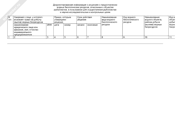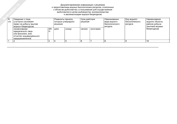 - 675Права на добычу (вылов) водных биоресурсов, отнесенных к объектам рыболовства. Документированная информация о решениях о предоставлении водных биологических ресурсов, отнесенных к объектам рыболовства, в пользование для осуществления рыболовства в целях рыбоводства, воспроизводства и акклиматизации водных биоресурсов. Форма № 4.2.5.-грр