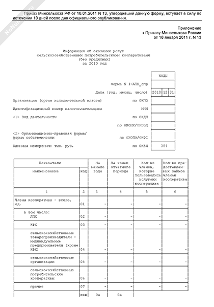 - 754Информация об оказании услуг сельскохозяйственными потребительскими кооперативами (без кредитных) за 2010 год. Форма № 1-АПК_спр