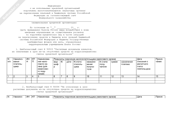 Информация о не исполненных кредитной организацией поручениях налогоплательщиков (налоговых органов) на перечисление платежей в бюджетную систему Российской Федерации на соответствующий счет Федерального казначейства