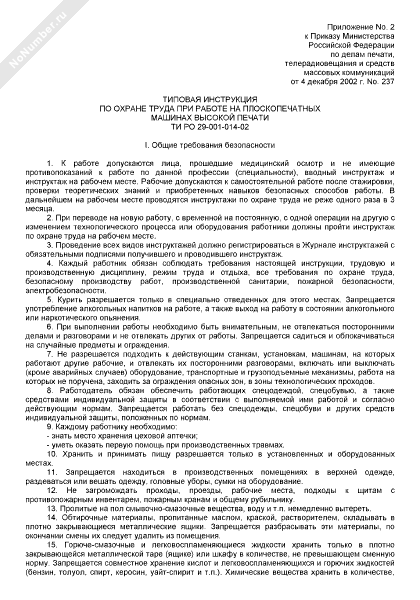 - 234Типовая инструкция по охране труда при работе на плоскопечатных машинах высокой печати ТИ РО 29-001-014-02
