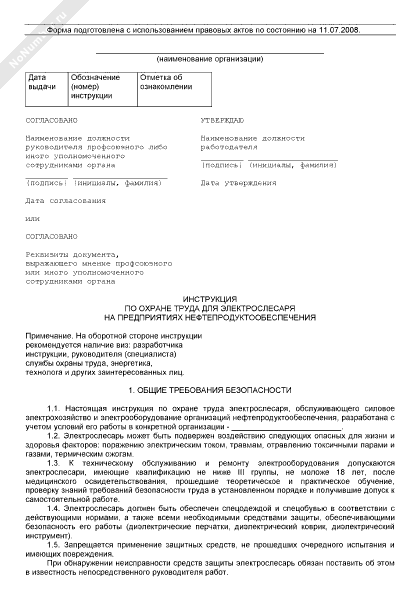 Инструкция по охране труда для электрослесаря на предприятиях нефтепродуктообеспечения (рекомендуемый образец заполнения)