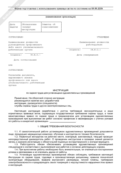 Инструкция по охране труда для установщика художественных произведений (рекомендуемый образец заполнения)