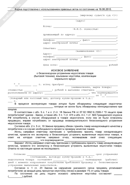 - 242Исковое заявление о безвозмездном устранении недостатков товара (бытовой техники), взыскании неустойки, компенсации морального вреда