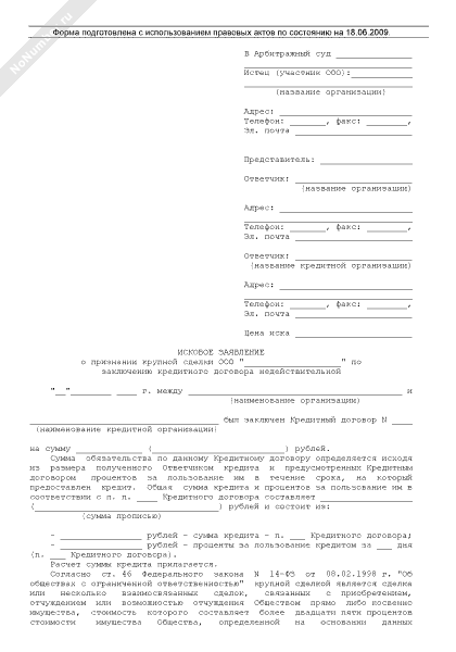 - 243Исковое заявление о признании крупной сделки общества с ограниченной ответственностью о заключении кредитного договора недействительной