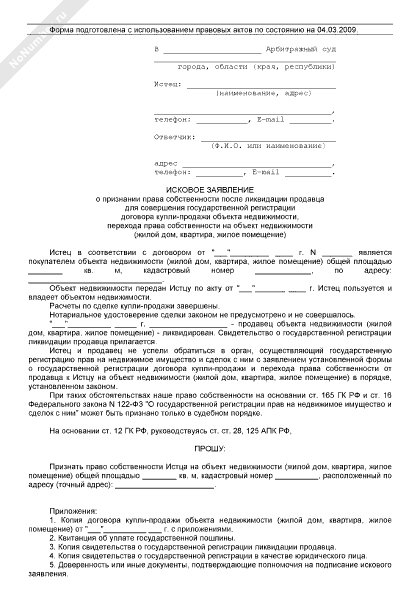 - 255Исковое заявление о признании права собственности после ликвидации продавца для совершения государственной регистрации договора купли-продажи объекта недвижимости, перехода права собственности на объект недвижимости (жилой дом, квартира, жилое помещение)