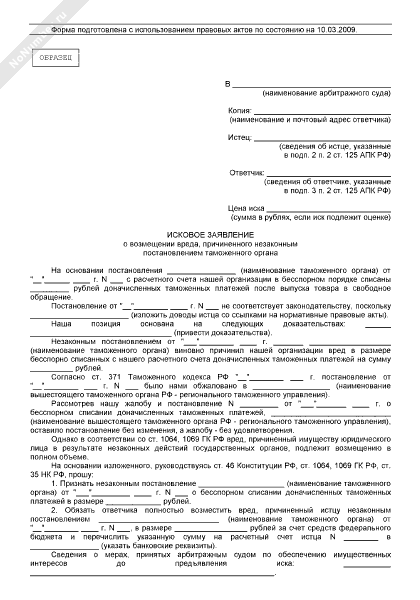 - 245Исковое заявление о возмещении вреда, причиненного незаконным постановлением таможенного органа