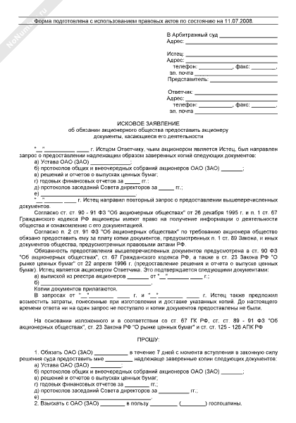 - 244Исковое заявление об обязании акционерного общества предоставить акционеру документы, касающиеся его деятельности