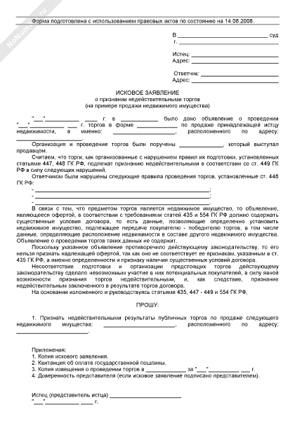 - 301Исковое заявление о признании недействительными торгов (на примере продажи недвижимого имущества)
