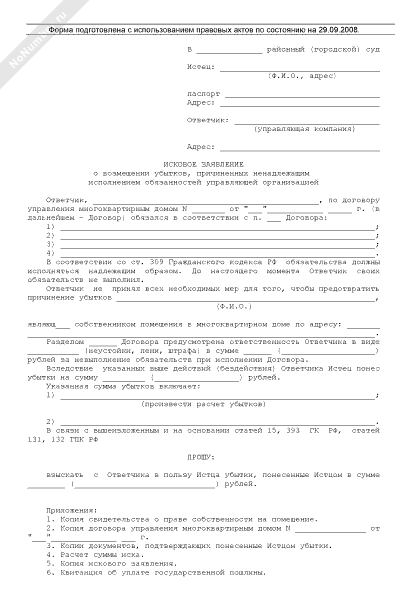- 317Исковое заявление о возмещении убытков, причиненных ненадлежащим исполнением обязанностей управляющей организацией
