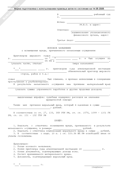 - 303Исковое заявление о возмещении вреда, причиненного незаконным осуждением (осужденный был оправдан и реабилитирован приговором суда апелляционной инстанции)