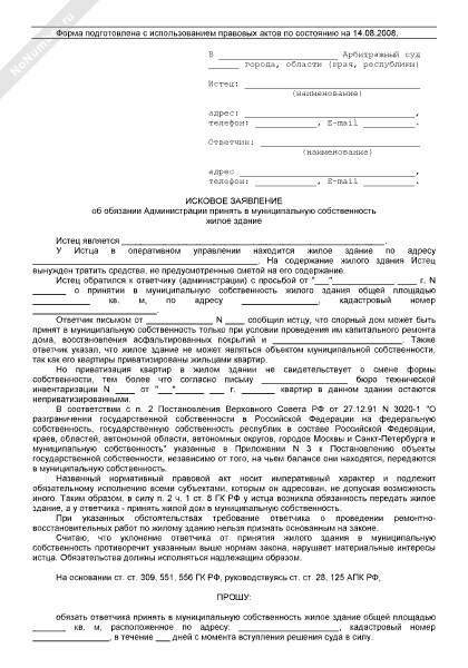 - 311Исковое заявление в арбитражный суд об обязании администрации принять в муниципальную собственность жилое здание
